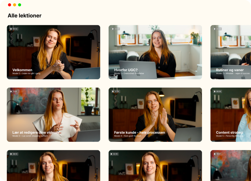I ugckursus.dk finder du 37 gennemarbejdede videoer med mine erfaringer og principper, der har skabt og sikrer min karriere som UGC Creator. Videoerne tager dig trin for trin gennem processen, så du selv kan blive UGC Creator.